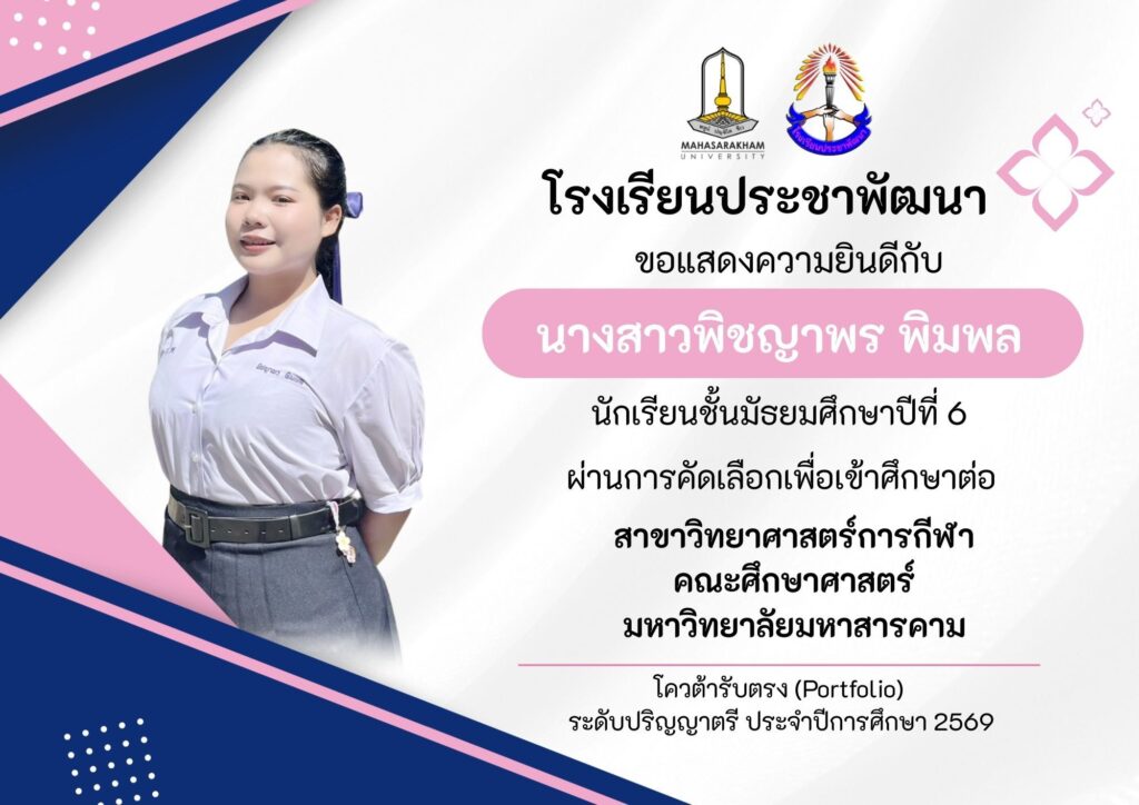 โรงเรียนประชาพัฒนา รับสมัครนักเรียน ปีการศึกษา 2569 ชั้นมัธยมศึกษาปีที่ 1 และชั้นมัธยมศึกษาปีที่ 4 วันที่ 19-23 มีนาคม 2569 (ไม่เว้นวันหยุดราชการ) <<รายละเอียดคลิก>>