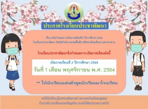 แจ้งกำหนดการเปิดภาคเรียนที่ 2 ปีการศึกษา 2564 โรงเรียนประชาพัฒนา สังกัดสำนักงานเขตพื้นที่การศึกษามัธยมศึกษา ในวันที่ 1 พฤศจิกายน 2564(ประกาศวันที่ 29 ตุลาคม 2564)