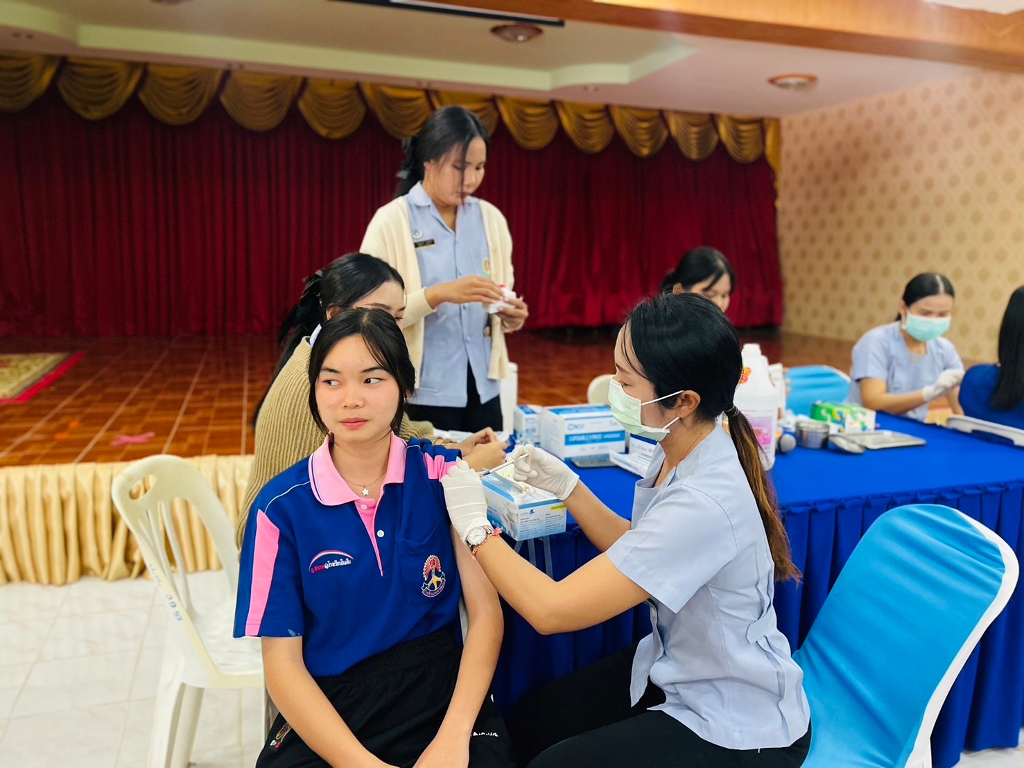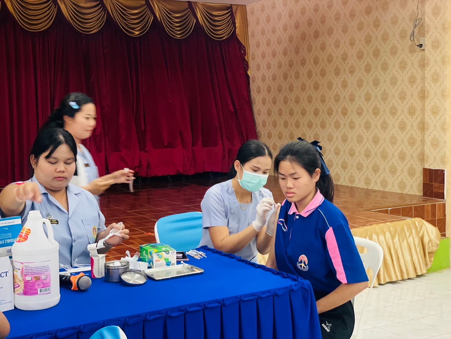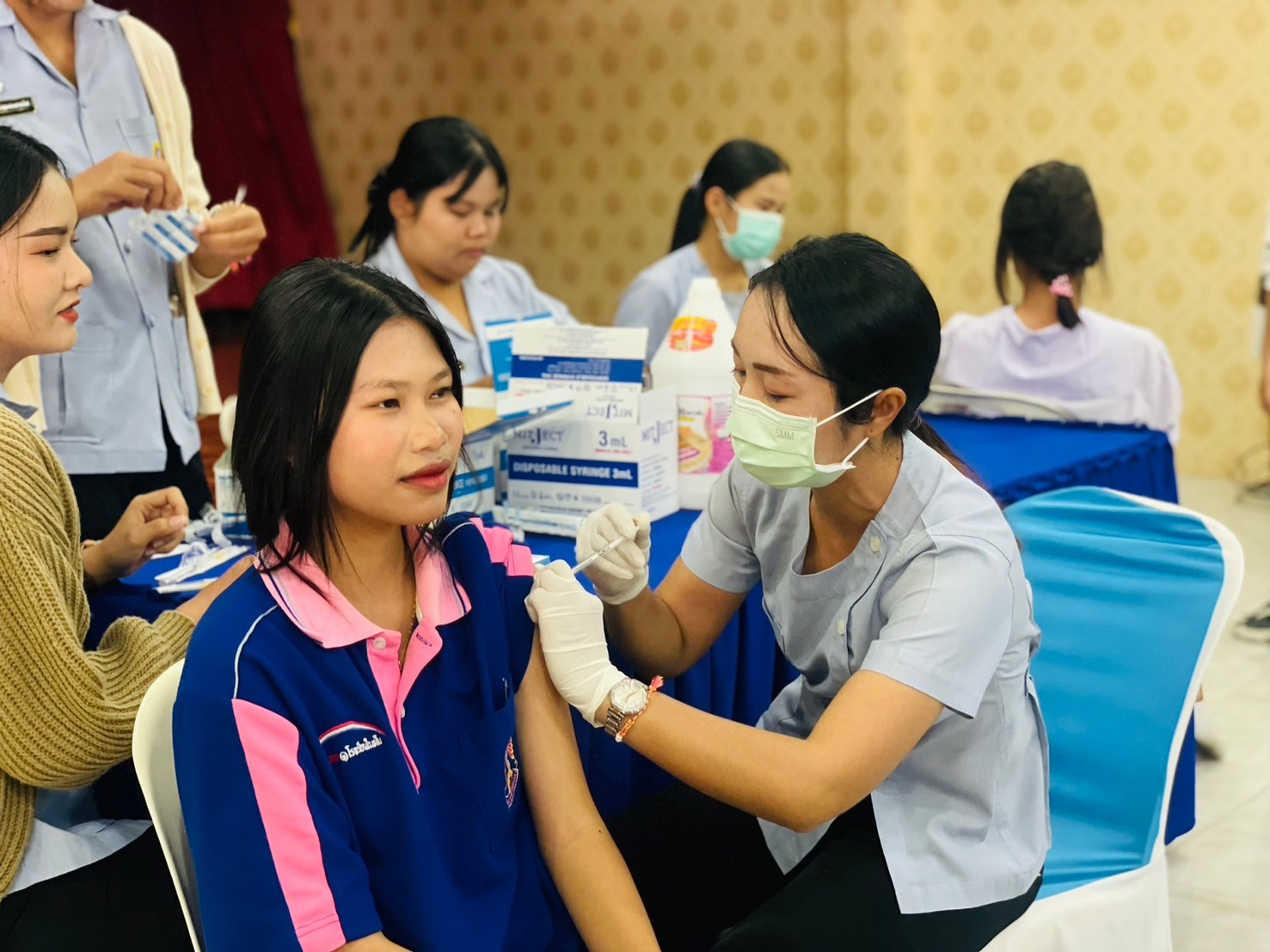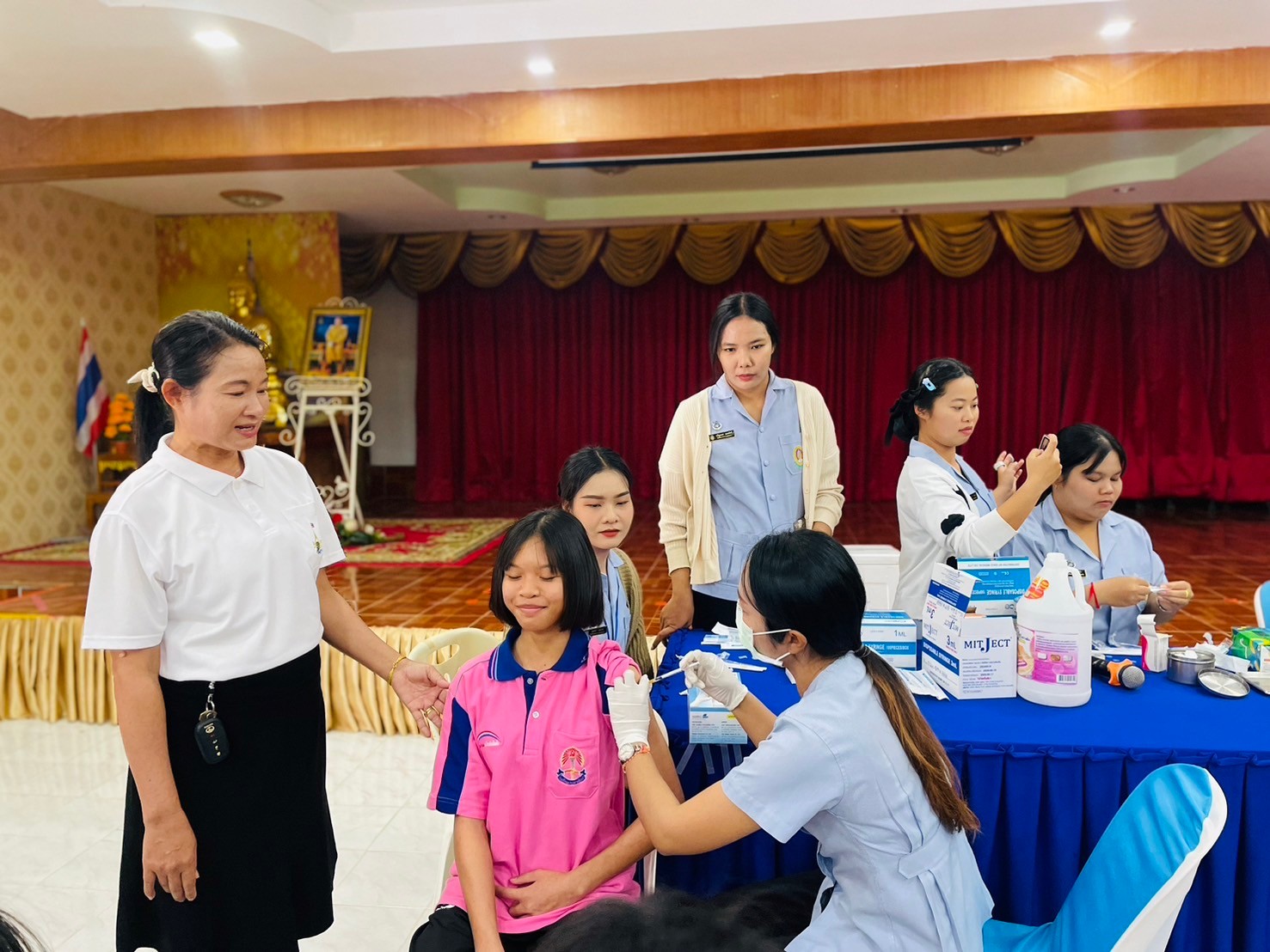 วันที่ 17-มกราคม 2567 นายจักรินทร์ สวาศรี ผู้อำนวยการโรงเรียน มอบหมายให้นางสาวรัตน์ชนัญญา เกตุมาลา รองผู้อำนวยการโรงเรียน พร้อมด้วยครูผู้มีส่วนเกี่ยวข้องร่วมกำกับดูแลนักเรียนหญิงชั้นมัธยมศึกษาปีที่ 2-3 เข้ารับการฉีดวัคซีนป้องกันการติดเชื้อไว้รัส HPV โดยได้รับความอนุเคาระห์จาก โรงพยาบาลส่งเสริมสุขภาพประจำตำบลประชาอาสา ณ ห้องโสตทัศนศึกษา โรงเรียนประชาพัฒนา โรงเรียนประชาพัฒนาขอขอบพระคุณมา ณ โอกาสนี้